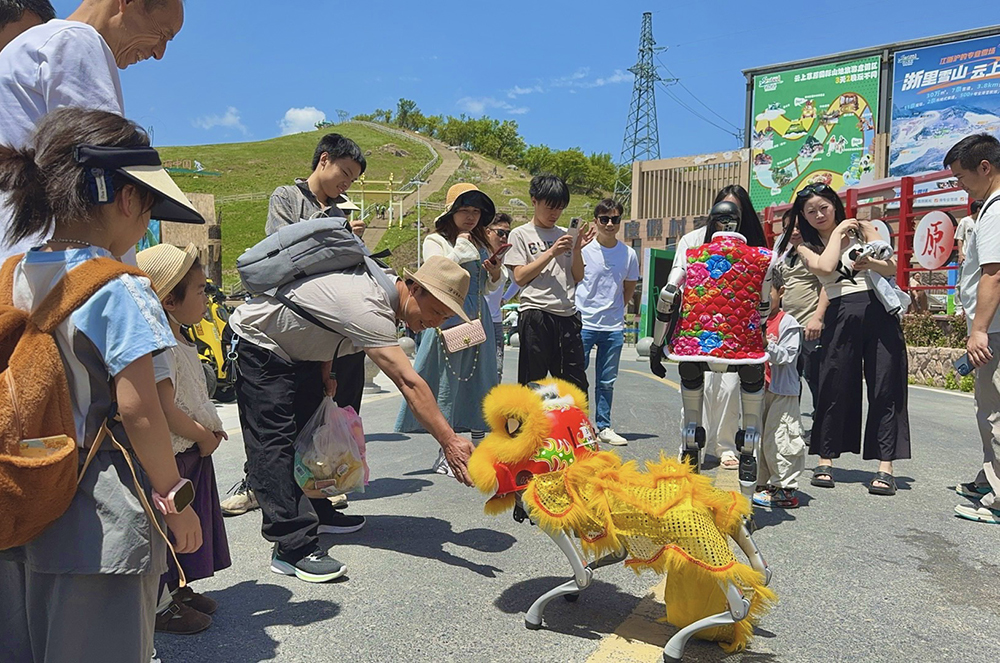宇樹(shù)機(jī)器人與機(jī)器狗戰(zhàn)隊(duì)正在草坪上“營(yíng)業(yè)”,科技感十足的巡游表演吸引大批游客圍觀。萌寵機(jī)器人不僅能隨音樂(lè)蹦迪,還能與小朋友擊掌互動(dòng),現(xiàn)場(chǎng)歡笑聲不斷。
