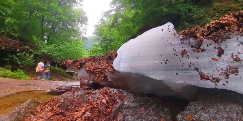 景區(qū)工作人員介紹,大冰溝森林公園地處中溫帶低海拔地區(qū),屬峽谷地貌,冬天山泉凍結成厚厚的冰蓋,第二年8月才會完全消融,形成了夏季“冰瀑”奇觀。游客行走在森林公園中,不禁為“左手盛夏右手冬”的奇妙體驗折服。