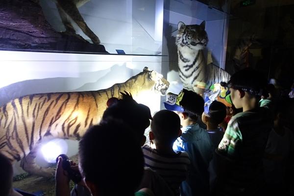 孩子們?cè)趪覄?dòng)物博物館熄燈環(huán)境里用手電筒照明,觀察孟加拉虎和東北虎標(biāo)本。受訪者供圖