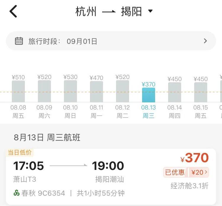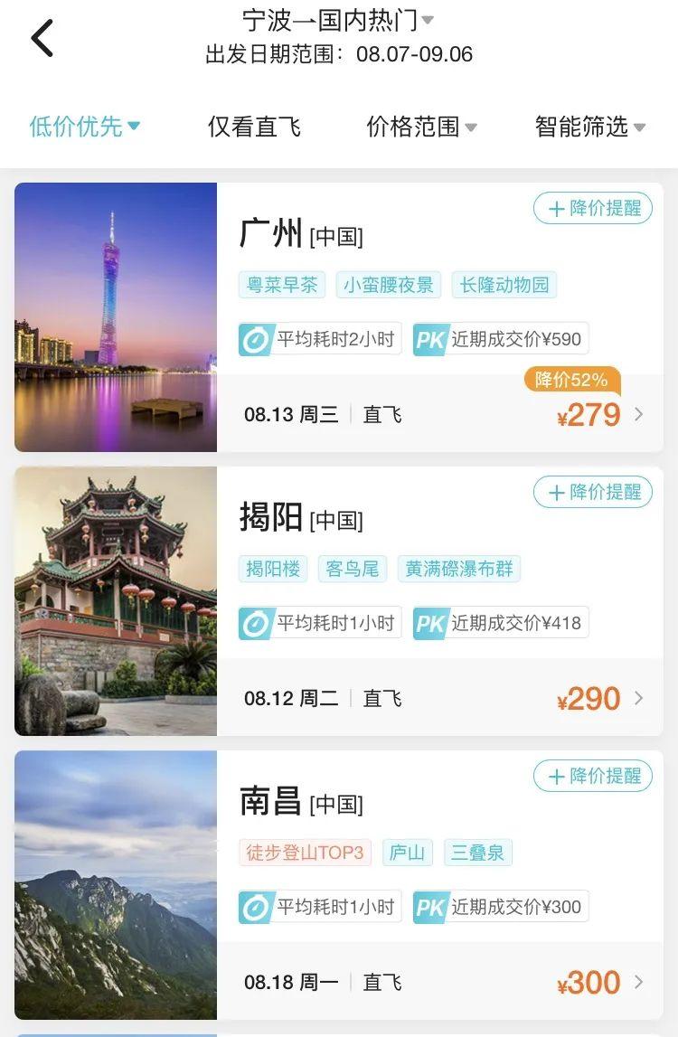 8月中旬,寧波飛廣州、揭陽的機(jī)票價(jià)格2字頭就可拿下,比如8月13日寧波飛廣州最低票價(jià)僅需279元(不含稅),8月12日寧波直飛揭陽機(jī)票價(jià)格最低僅需290元(不含稅)。