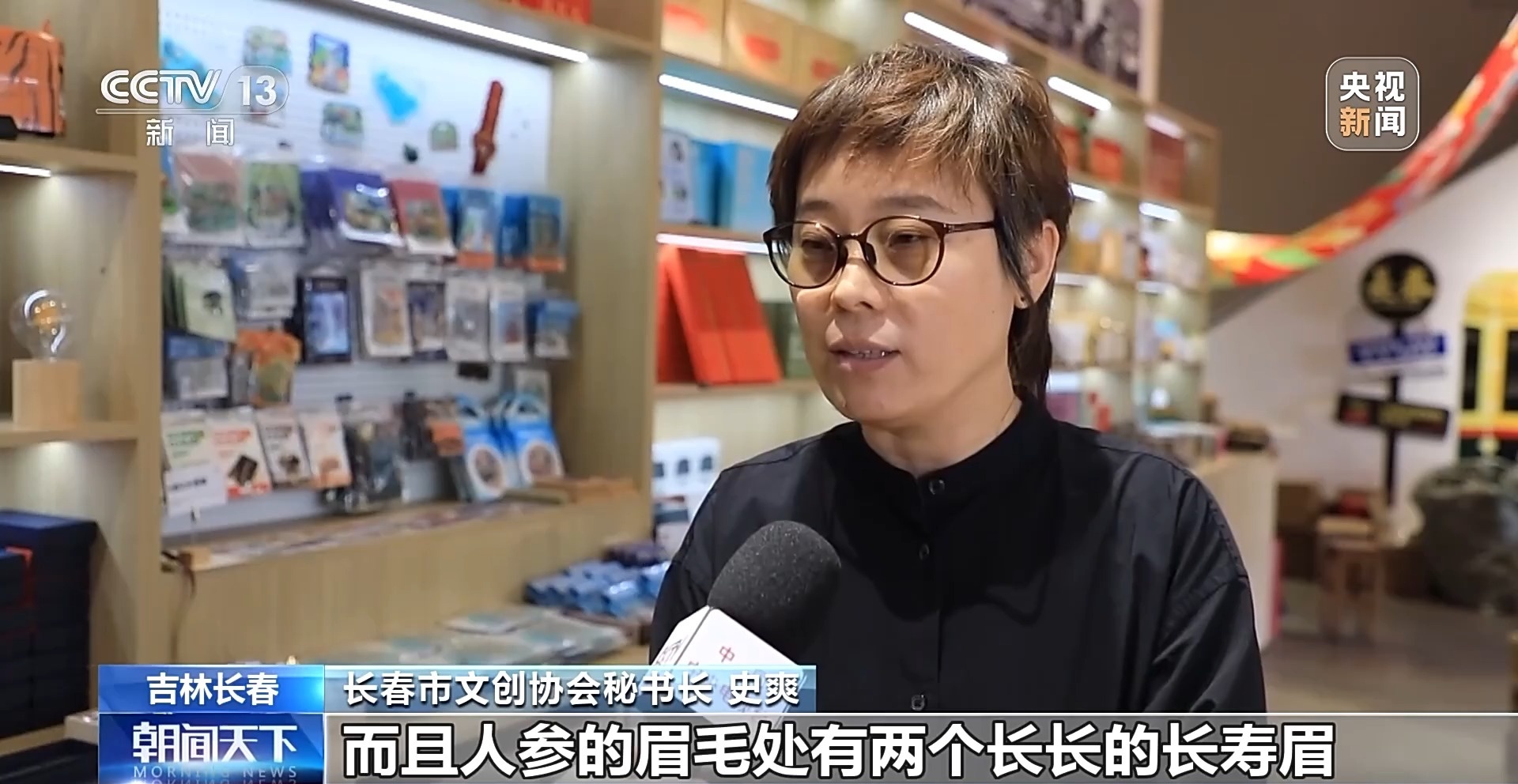 長(zhǎng)春市文創(chuàng)協(xié)會(huì)秘書長(zhǎng) 史爽:因?yàn)槲覀兗质∈侨藚⒌闹饕a(chǎn)地,上面的紅圍脖結(jié)合了我們?cè)械娜藚⒌涔,系紅繩的這樣的一個(gè)典故,而且人參的這眉毛處有兩條長(zhǎng)長(zhǎng)的長(zhǎng)壽眉,象征著吉祥如意。