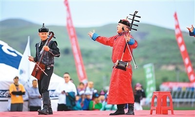 演員在內(nèi)蒙古自治區(qū)第十一屆少數(shù)民族傳統(tǒng)體育運(yùn)動(dòng)會(huì)(巴林右旗分賽場(chǎng))開(kāi)賽儀式上表演。