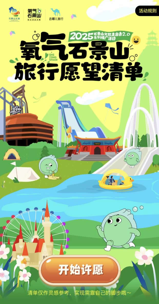 在“去哪兒”旅行APP上線“氧氣石景山”文旅專題頁,不僅整合酒店榜單、景區(qū)門票、優(yōu)質(zhì)攻略等核心文旅資源,更特別設(shè)置石景山區(qū)對口支援和協(xié)作地文旅產(chǎn)品版塊,實現(xiàn)“石景山推廣+支援地區(qū)助銷”雙重價值。同步推出的“旅行打卡愿望清單”H5,線上用戶可點亮自己的石景山旅游心愿,生成專屬旅行愿望清單;在高校路演活動中,大學(xué)生可分享H5到社交媒體作為參與活動的入場券——既為高;顒宇A(yù)熱,更成為高校路演入場憑證,串聯(lián)起“線上互動-線下參與”的閉環(huán)。