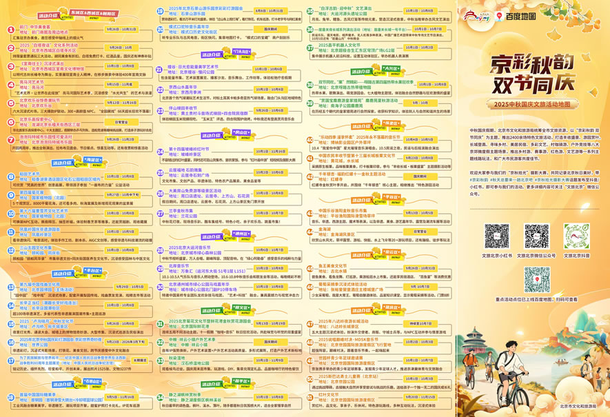 為豐富假期生活,北京市文化和旅游局聯(lián)合百度地圖推出“中秋國慶文旅活動地圖”,集中呈現(xiàn)全市50余項(xiàng)特色文旅活動,涵蓋自然風(fēng)光、文化體驗(yàn)、親子娛樂、紅色教育等多個主題,助力公眾輕松規(guī)劃假日行程,盡享京秋韻味。