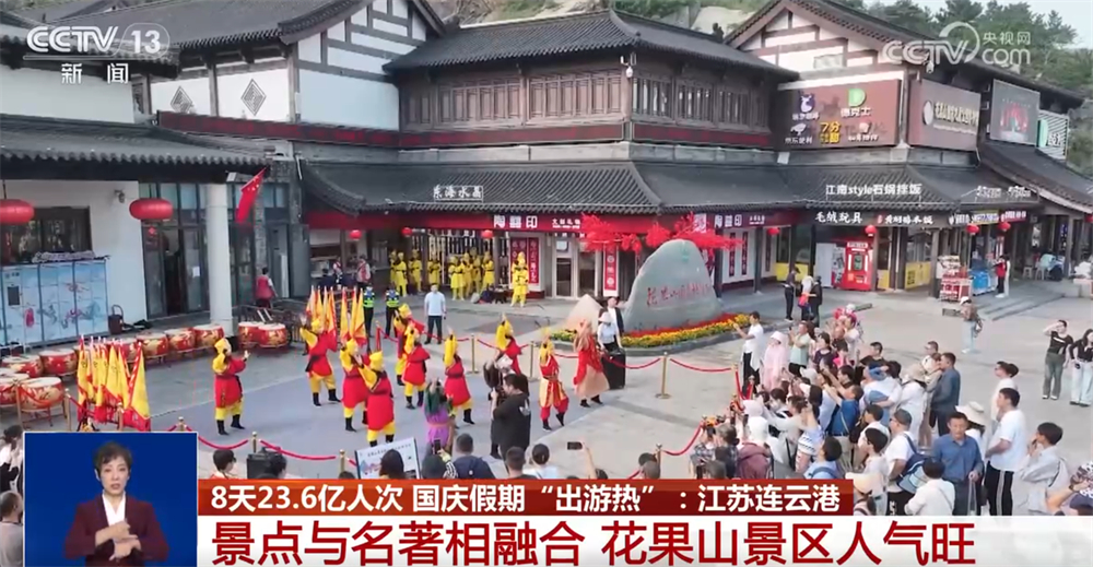 沿著蜿蜒山路,游客們拾級而上,走進“水簾洞”登上“玉女峰”,感受藍天如洗、白云舒展的豪邁。不少游客還在山頂揮舞國旗,慶祝共和國生日;ü骄皡^(qū)將景點與名著深度融合,為游客準備了取材自《西游記》精彩片段的情景演出,分布在游客上山的途中,精彩節(jié)目輪番登場,為游客營造出熱鬧喜慶氛圍。
