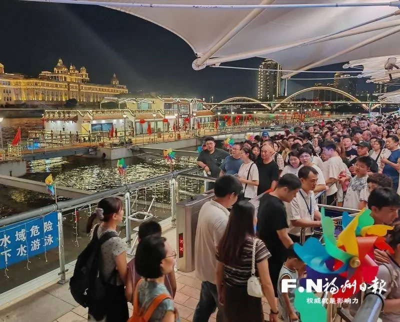 國慶中秋假期,閩江夜游游客流量大增,等待上船的游客排起長隊。(八方客運(yùn)公司供圖)