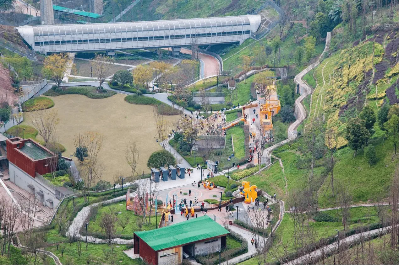 依山就勢(shì),渝中區(qū)推進(jìn)21萬平方米坡坎崖由“禿斑”變“綠毯”、由“荒地”變“游園”、由“治理點(diǎn)”變“打卡點(diǎn)”。實(shí)現(xiàn)了鵝嶺—虎頭巖10.8公里山脊線綠蔭如蓋,長江、嘉陵江11.5公里濱水綠帶織綠成廊。渝中在紅巖公園充分利用“漏斗”地形,擋墻加固崖壁緩坡,生態(tài)復(fù)綠4.35萬平方米,中間平坦區(qū)域開辟為兒童樂園,入選全國兒童友好空間典型案例。