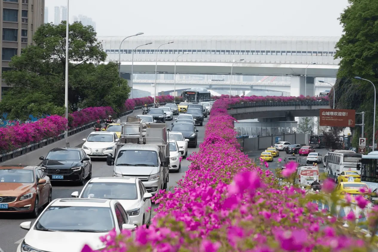 依托密集的立體交通網(wǎng)絡(luò),渝中區(qū)聚焦立交高架、人行天橋、軌道墩柱,打造四季有綠、全年可觀的路上風(fēng)景線,賦予城市交通色彩與活力。渝中區(qū)充分利用中興路高架橋兩側(cè)空間,通過鋼結(jié)構(gòu)支撐,加掛耐修剪、易養(yǎng)護(hù)的三角梅花箱,形成500米空中花廊。