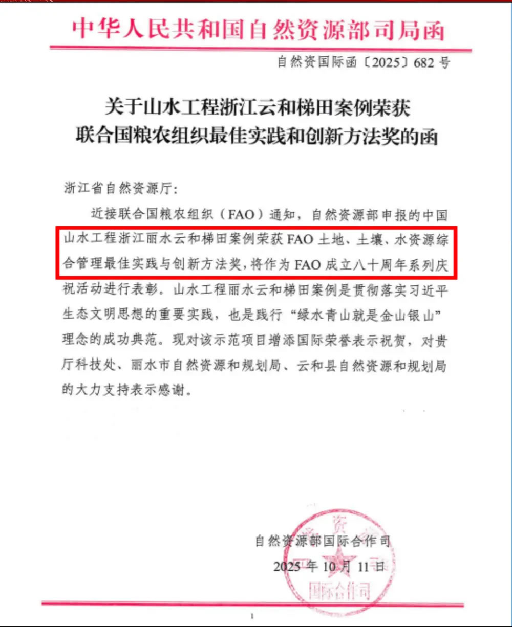 近日,中國山水工程浙江云和梯田項(xiàng)目榮獲聯(lián)合國糧農(nóng)組織最佳實(shí)踐和創(chuàng)新方法獎,并將作為聯(lián)合國糧農(nóng)組織(FAO)成立八十周年系列慶;顒舆M(jìn)行表彰。