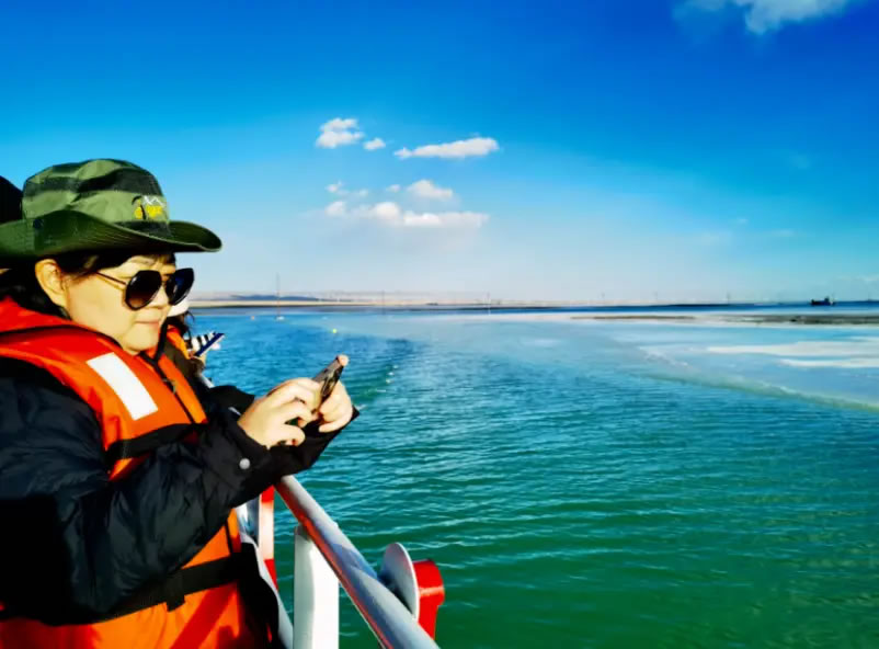 10月14日,由中共海西州委宣傳部主辦、西海都市報社承辦的“紅杞風光別樣美 ”活動,走進海西蒙古族藏族自治州烏蘭縣,研學團隊來到茶卡鹽湖,乘坐游船觀光,湖面上駛來的大型運鹽船讓外省記者及學生不由感嘆:沒想到“天空之鏡”還有另外一種獨特景致。湖面上駛來的大型運鹽船吸引了研學團隊成員的目光。采鹽船正在鹵水中作業(yè),發(fā)出低沉的轟鳴,空氣中彌漫著咸潤的氣息。研學的同學通過實地觀察鹵水的蒸發(fā)、結(jié)晶過程,將課本上的地理、化學知識,與這片壯麗的現(xiàn)實場景融會貫通。