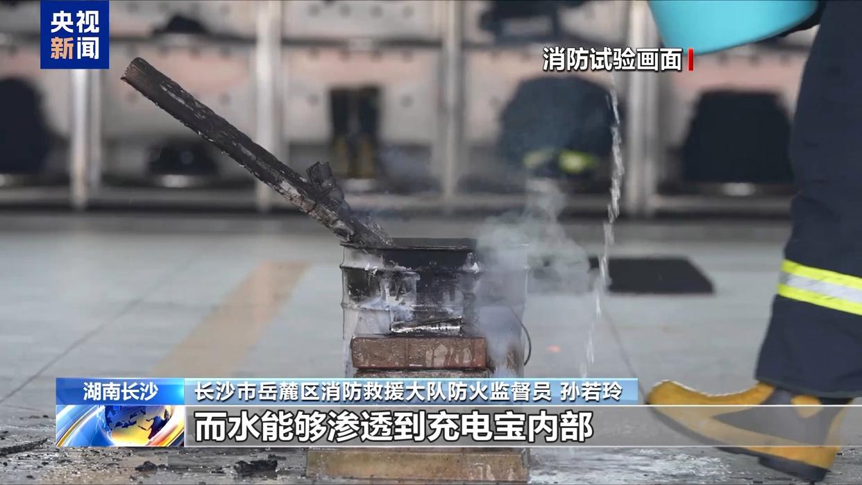 長(zhǎng)沙市岳麓區(qū)消防救援大隊(duì)防火監(jiān)督員 孫若玲:干粉滅火器的滲透性和降溫效果比較差,在應(yīng)對(duì)充電寶著火時(shí)效果并不理想,而水能夠滲透到充電寶內(nèi)部,有效滅火并起到降溫作用。