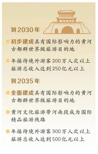 《規(guī)劃》設(shè)定的雙階段目標(biāo),為黃河古都群的發(fā)展錨定了清晰航向。到2030年,初步建成具有國(guó)際影響力的黃河古都群世界級(jí)旅游目的地,年接待境外游客200萬(wàn)人次以上,旅游總收入達(dá)到250億元以上;到2035年,全面建成具有國(guó)際影響力的黃河古都群世界級(jí)旅游目的地,黃河文化旅游帶河南段成為國(guó)際精品旅游線路,年接待境外游客300萬(wàn)人次以上,旅游總收入達(dá)到500億元以上。
