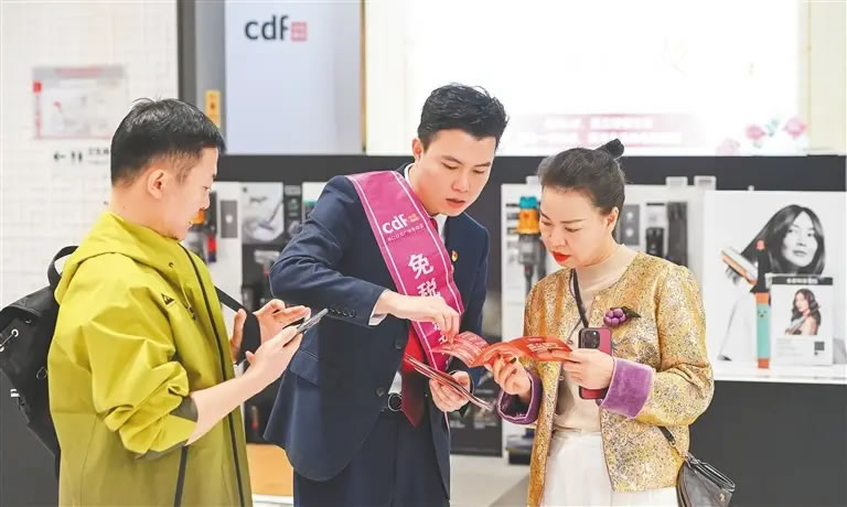 元旦假期,在中免集團(tuán)?谌赵聫V場(chǎng)免稅店,工作人員向游客介紹免稅政策。新華社記者 楊冠宇 攝