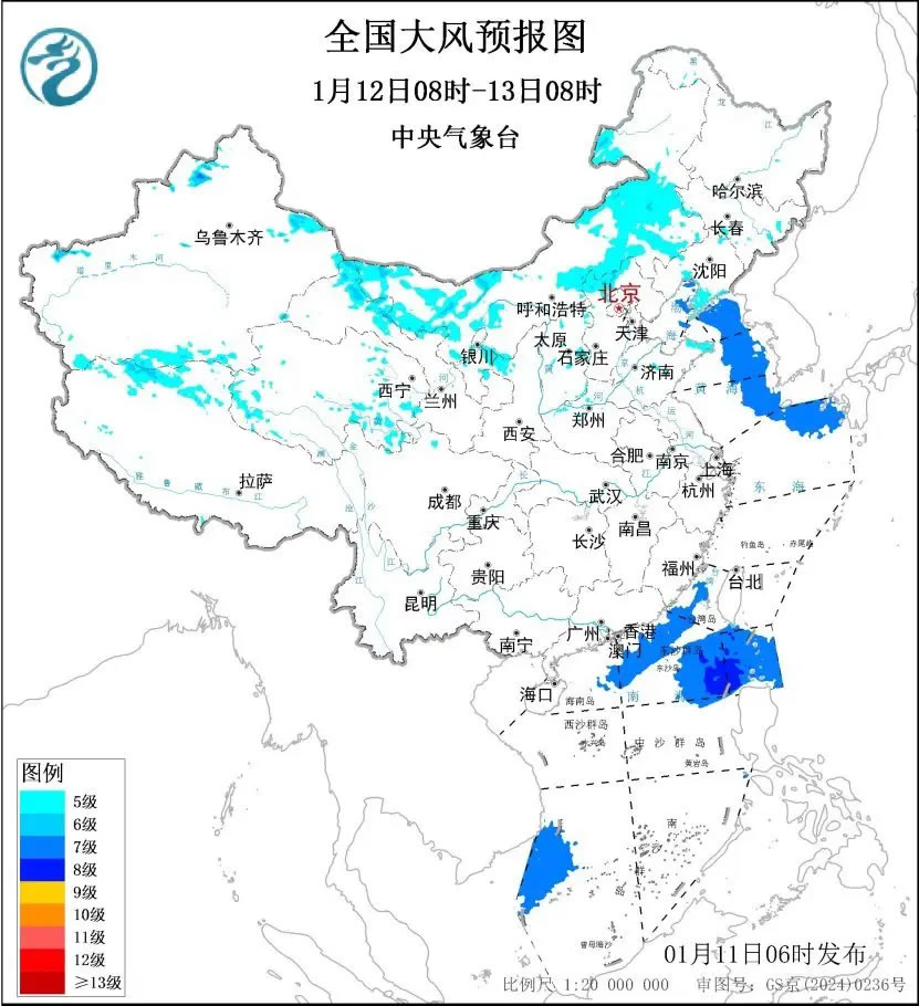 1月12日08時(shí)至13日08時(shí),內(nèi)蒙古中西部、甘肅西部、寧夏北部、華北北部、山東半島、遼東半島等地部分地區(qū)有5~6級(jí)大風(fēng)、陣風(fēng)7~9級(jí);渤海、渤海海峽、黃海大部海域、東海北部海域、臺(tái)灣海峽、巴士海峽、南海北部和西南部海域?qū)⒂?~8級(jí)、陣風(fēng)9級(jí)的風(fēng)。