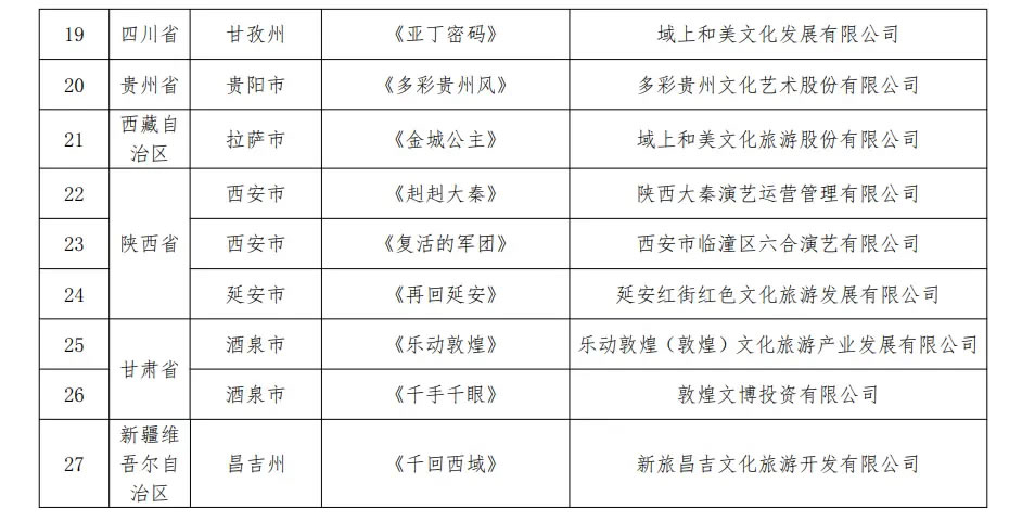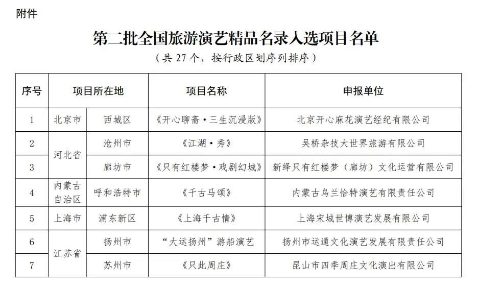 央廣網(wǎng)北京1月16日消息(記者 宋雪)文化和旅游部辦公廳近日發(fā)布通知,公布第二批全國旅游演藝精品名錄入選項(xiàng)目名單,《只有紅樓夢(mèng)·戲劇幻城》《赳赳大秦》《樂動(dòng)敦煌》等27個(gè)項(xiàng)目入選。