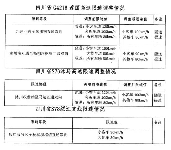 G4216蓉麗高速沐川南互通至楊柳壩樞紐互通雙向限速調(diào)整。調(diào)整前,小客車(chē)道限速每小時(shí)100公里,客貨車(chē)道限速每小時(shí)80公里,隧道內(nèi)所有車(chē)輛限速每小時(shí)80公里。調(diào)整后,全路段(包括隧道)小客車(chē)限速每小時(shí)90公里,其他車(chē)輛限速每小時(shí)80公里。