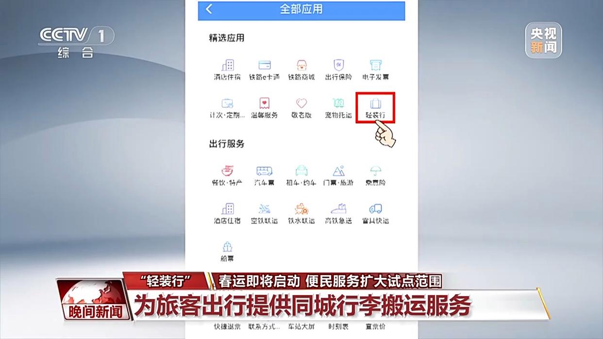 “輕裝行”是鐵路部門為旅客出行提供的“門到站”“站到門”同城行李搬運服務。已購車票的旅客只需打開鐵路12306App或微信小程序,在首頁中部應用欄向左滑動,找到“全部應用”,點擊進入即可找到“輕裝行”模塊,根據(jù)需求預約下單。