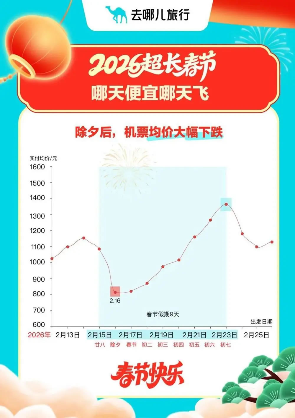另?yè)?jù)去哪兒旅行大數(shù)據(jù),進(jìn)入2月9日(農(nóng)歷臘月二十二)節(jié)前一周,預(yù)訂機(jī)票出行的旅客量就開始逐日增加,到2月14日(二十七)達(dá)到節(jié)前高峰。機(jī)票價(jià)格則跟出行量成正比,到2月15日(二十八)春節(jié)假期第一天,機(jī)票價(jià)格開始回落,2月16日(二十九,即除夕)降至節(jié)日期間最低點(diǎn),17日-19日機(jī)票價(jià)格都相對(duì)劃算。