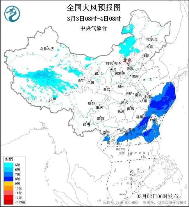 預(yù)計,3月2日08時至3日08時,新疆東部、西藏中西部、青海北部、內(nèi)蒙古大部、江蘇東部等地將有5~6級、陣風(fēng)7~8級的大風(fēng);黃海中部和南部海域、東海大部海域、臺灣海峽、臺灣以東洋面、南海東北部偏北海域?qū)⒂?~8級、陣風(fēng)9級的大風(fēng),其中黃海東南部海域、東海北部海域風(fēng)力可達(dá)9~10級、陣風(fēng)11級。