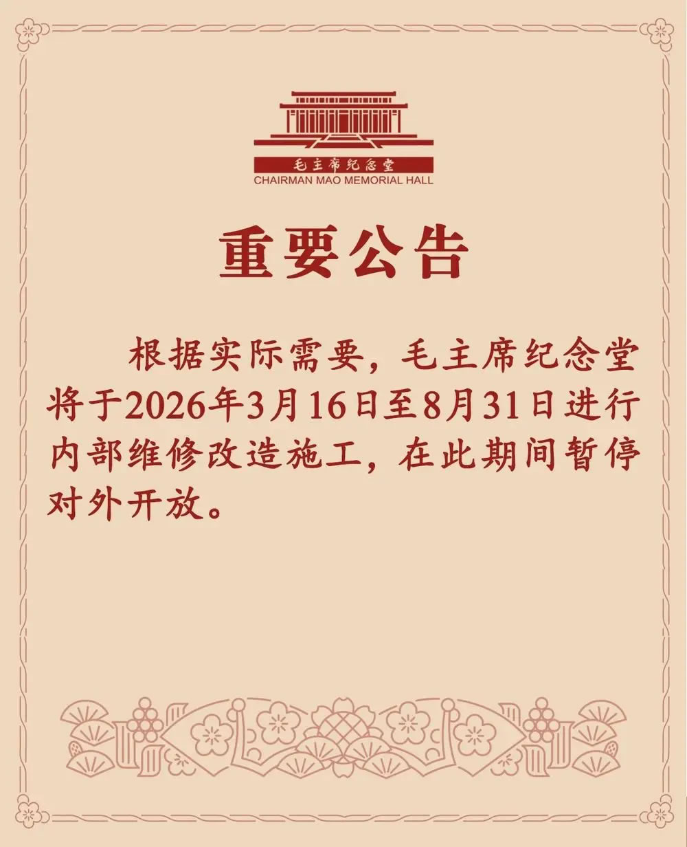 3月13日,毛主席紀(jì)念堂發(fā)布公告,3月16日至8月31日內(nèi)部維修改造施工,期間暫停對外開放。
