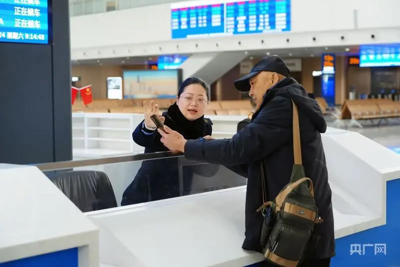 廈門北站“海峽情·小白鷺”服務臺工作人員為旅客答疑解惑。(央廣網(wǎng)發(fā) 安昕宇攝)