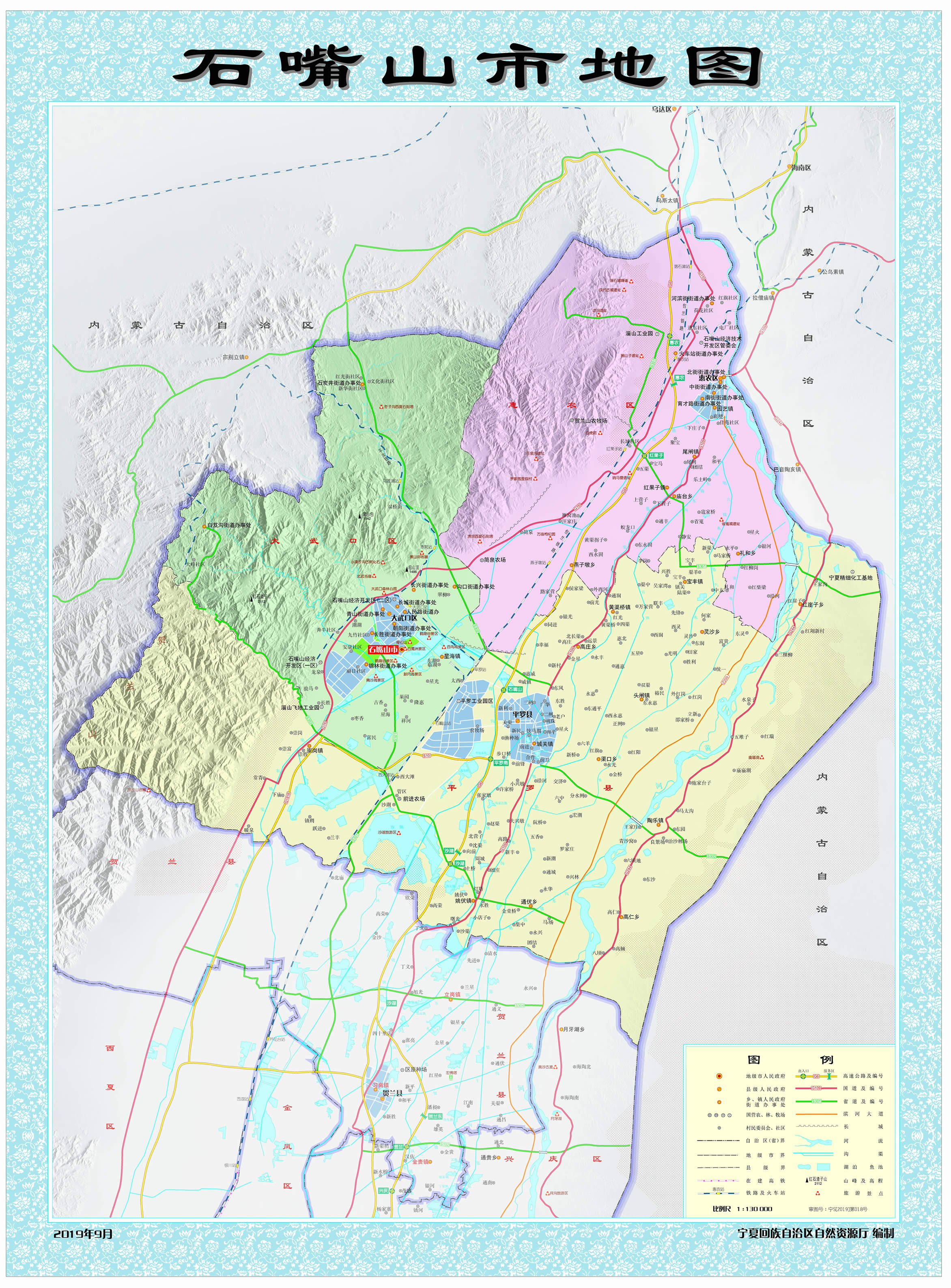 1975年11月23日,撤銷銀北地區(qū),恢復(fù)石嘴山市。石嘴山市因賀蘭山與黃河交匯處“山石突出如嘴”而得名,歷史悠久,秦朝時(shí)設(shè)渾懷障,西漢時(shí)設(shè)置第一個行政建制——廉縣,悠久歷史造就了厚重的文化底蘊(yùn),孕育了賀蘭山巖畫、古長城、北武當(dāng)壽佛寺、平羅玉皇閣、田州塔等人文古跡,擁有移民文化、賀蘭山文化、工業(yè)文化等民宿文化;地理位置較為優(yōu)越,地處寧東、蒙西兩個國家千億噸級煤田之間,是呼包銀蘭經(jīng)濟(jì)帶、寧夏沿黃經(jīng)濟(jì)區(qū)、寧蒙陜?yōu)踅鹑墙?jīng)濟(jì)區(qū)的重要節(jié)點(diǎn)城市;距銀川河?xùn)|機(jī)場100千米,包蘭鐵路、京藏高速、烏瑪高速、109國道、110國道等貫穿全境,被列為國家公路運(yùn)輸樞紐城市、區(qū)域流通節(jié)點(diǎn)城市之一;黃河穿東過,西依賀蘭山,湖泊星羅棋布。市境內(nèi)有5A級旅游景區(qū)沙湖、國家水利風(fēng)景區(qū)星海湖等風(fēng)景名勝。