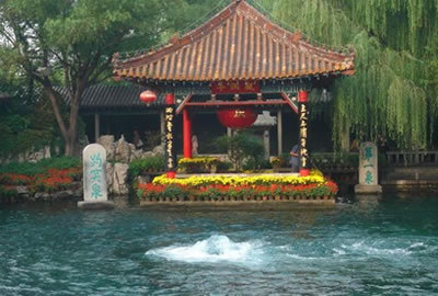 泉池西側(cè)的“觀瀾亭”建于明朝天順五年,亭內(nèi)石桌、石凳,可供游人休息賞泉之用。西墻上嵌刻的“觀瀾”為明代書法家的所書,“第一泉”石刻,是清朝同治年間書法家王鐘霖的墨跡,亭西“趵突泉”石碑,是明代山東巡府胡纘宗手筆。泉東池的北岸,水邊窗明幾凈的建筑就是素有勝名的蓬萊社,又稱望鶴亭茶社,想當(dāng)年康熙、乾隆兩個(gè)皇帝都曾在這里臨水靜坐,品茗賞泉。當(dāng)品嘗到趵突泉水后竟將南巡中攜飲的北京玉泉水全部換成趵突泉水,故有“潤(rùn)澤春茶味更真”,“不飲趵突水,空負(fù)濟(jì)南游”之說(shuō)。