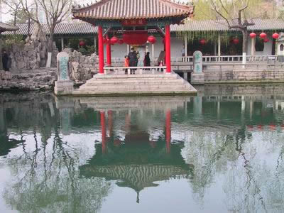 有一組較大的古建筑群在趵突泉北岸,通稱三大殿。最南“濼源堂”,三間兩層,歇山飛檐,建于北宋年間,挹廈柱上,刻有元代文學(xué)家、書法家趙孟兆的著名詩(shī)句:“云霧潤(rùn)蒸華不住,波濤聲震大明湖。”字體雄渾有力,詩(shī)句傳神,與波光水影交相輝映更為之添彩。殿后面又有兩殿,原為“娥姜祠”,現(xiàn)改寫為“娥英祠”,世人為贊頌舜的兩位妃子娥皇、女英而建祠,以志紀(jì)念。在三大殿院內(nèi)的花格透墻上,鑲嵌著30余方石刻,都是歷代名人的詩(shī)篇。特別珍貴而又不同凡響的是院內(nèi)的那尊的“雙御碑”,記載著康熙三臨、乾隆二臨趵突泉的題詞詩(shī)文,標(biāo)示著趵突泉的非凡地位。