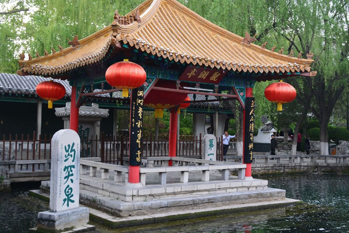 趵突泉的南大門橫匾“趵突泉”藍(lán)底金字,是清朝乾隆帝的御筆,有人譽(yù)為中國(guó)園林“第一門”。