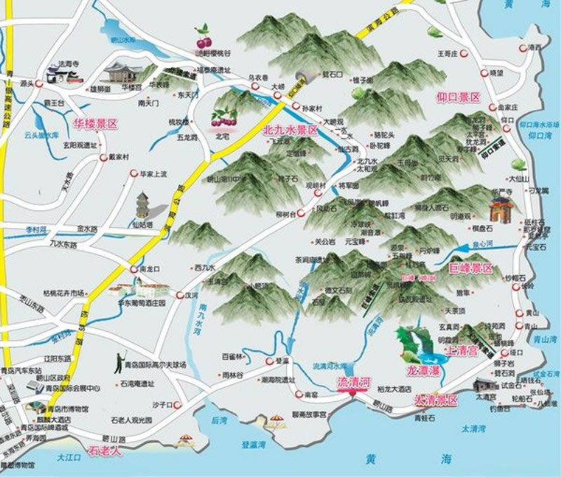 3、中線:也是由李滄區(qū)李村出發(fā),向東經(jīng)北龍口轉北,經(jīng)北宅,烏衣巷赴北九水景區(qū)。若時間允許,此線可于途中游覽華樓景區(qū);亦可驅車經(jīng)柳樹臺攀巨峰,步行過潮音瀑亦可達巨峰。由大嶗觀可轉赴仰口景區(qū)。