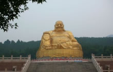 彌勒勝苑正門的牌坊高9.9米,寬12.5米,為四柱三門沖天式,整體造型莊重博大,氣勢不凡。主佛像為大肚彌勒佛,佛像通體高20米,采用3mm銅板焊接而成,花崗石質(zhì)的蓮花寶座高約9米,直徑30米,號稱“江北第一大佛 ”。佛像周圍的巖壁,雕刻了十八羅漢。主佛像身后的環(huán)形山崖上,是彌勒佛的生平事跡介紹的大型浮雕,其長36米,高3.5米,面積126平方米。