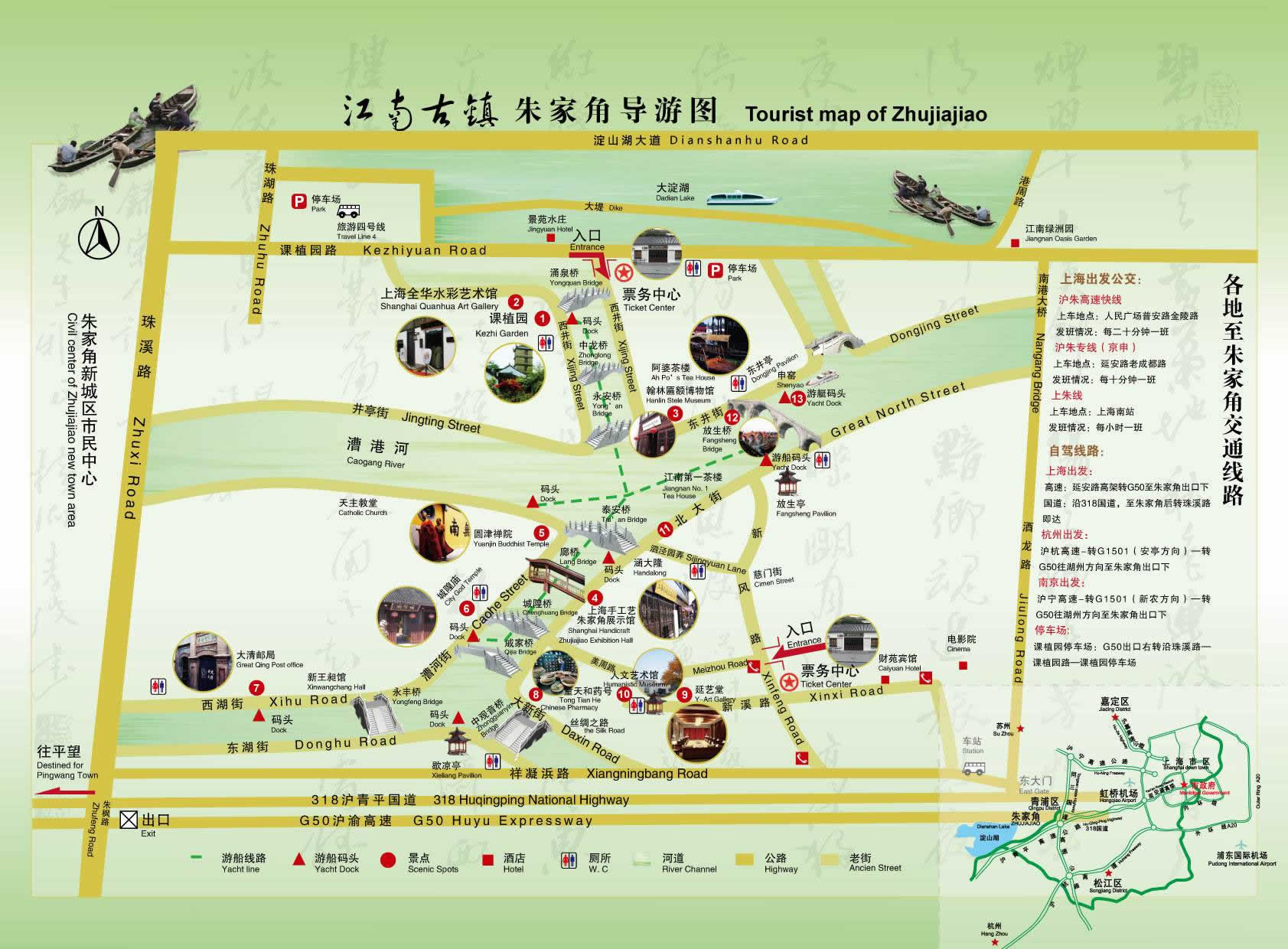 朱家角古鎮(zhèn)旅游區(qū)地處江、浙、滬二省一市交通要樞,地理位置十分優(yōu)越,東靠虹橋國際機(jī)場,北連昆山,南接嘉興,西通平望,淀山湖下游、黃金水道漕港河穿鎮(zhèn)而過。鎮(zhèn)內(nèi)河港縱橫,九條長街沿河而伸,千棟明清建筑依水而立,36座石橋古風(fēng)猶存,名勝古跡比比皆是。在玩膩了一個(gè)個(gè)雷同價(jià)高的人造景觀后,人們莫不驚訝于上海市郊還有一塊保存得如此完好的原汁原味、真山真水的天然景觀,在這里可以尋找一種回歸自然,崇尚野趣的享受。無怪乎一位同濟(jì)大學(xué)的名教授在考察朱家角古鎮(zhèn)旅游區(qū)后,不覺贊嘆:“朱家角古鎮(zhèn)旅游區(qū)有這么豐富的文化遺產(chǎn),不僅是上海一寶,也是國家的瑰寶”。臺灣著名已故作家三毛,到此曾為“小橋、流水、人家”的格局而迷戀,為清淳幽靜,處處可畫、時(shí)時(shí)有詩的風(fēng)情而陶醉。中共中央政治局委員、國務(wù)院副總理吳邦國在視察了古鎮(zhèn)朱家角古鎮(zhèn)旅游區(qū)后,不禁欣然命筆,寫下了“全國歷史名鎮(zhèn)朱家角古鎮(zhèn)旅游區(qū)”幾個(gè)大字。