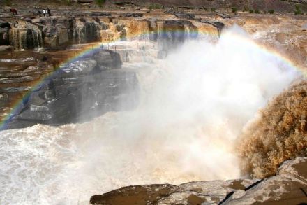 壺口瀑布反復(fù)沖擊所形成的水霧,升騰空中,使陽光發(fā)生折射而形成彩虹。彩虹有時呈弧形從天際插入水中,似長龍吸水;有時呈通直的彩帶橫在水面,象彩橋飛架,有時在濃煙騰霧中出現(xiàn)花團錦簇,五光十色,飄忽不定,撲朔迷離,為天下奇觀。