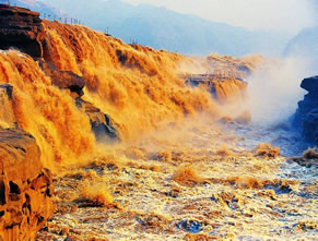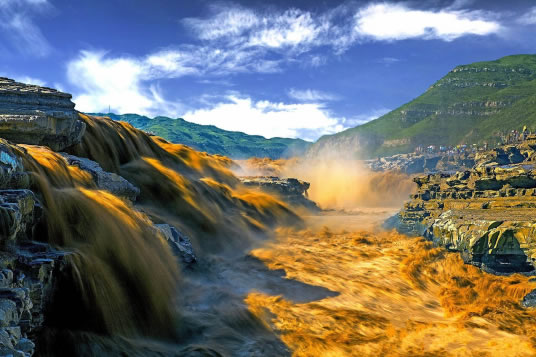 在高處河岸上,幾乎是看不到“龍槽”和黃河水流,只能看到紫褐色基巖河床中一線急騰翻卷的黃濁水塵和聽到轟鳴不息的奔騰濤聲。這槽中激流就象一鍋滾沸的水,左奔右奪,奔騰翻滾急下,激起的水霧彌漫在龍槽之上,使黃河在這里變得朦朦朧朧。每逢汛期黃河水漲時,洪水溢出壺口龍槽一端,龍槽東岸會出現(xiàn)一道一、二千米長的漫流水簾,十分壯觀。遠(yuǎn)望龍槽,彎彎曲曲的峽中石槽,活象一條搖頭擺尾的巨龍,壺口是龍頭,一口吞沒黃河巨流。孟門是龍尾,腹泄河水于下游。