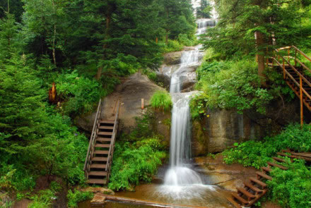 九重瀑布位于寧武縣東寨鎮(zhèn)大溝村腳下,在情人谷景點(diǎn)與馬侖草原之間,距東寨鎮(zhèn)約12公里。因其地勢(shì)高峻,天藍(lán)氣清,有似入天宇之感,故名“九重瀑布”。瀑布從森林密布的山谷石崖上直瀉而下,全場(chǎng)300余米,落差高達(dá)55米,流量120m/s,負(fù)氧離子28000個(gè)/cm,暑期最高氣溫19°C。