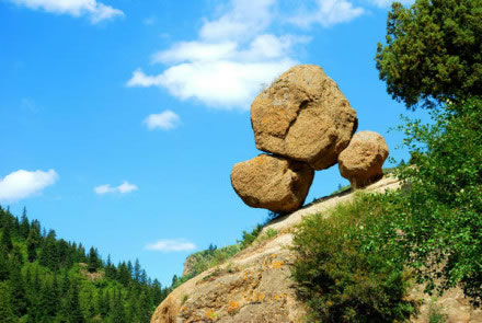 寧武縣城30公里處的東寨鎮(zhèn)西樓子山南麓半坡,有一座峭巖矗立于溝側(cè)溪畔。這峭巖高約兩丈余,頂部巍巍托起一塊巨大奇石。這奇石以兩塊小石作支腳,立于約三四十度的峭巖斜坡頂部。奇石高約3米,闊約2米。雖立斜坡,風(fēng)吹似動(dòng),但數(shù)干百年來(lái),它卻一直屹立在那里。由于奇石狀似加蓋的鍋,支撐它的兩小石形若鍋腳,故而人稱“支鍋奇石”,成為古寧武府和寧武縣八大奇景之一。據(jù)關(guān)專家考察,該奇石形成于第四紀(jì)冰川期。