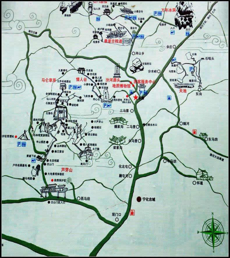 景區(qū)以蘆芽山(太子殿主峰)為中心,包括馬侖草原、小蘆芽山、萬(wàn)年冰洞、千年地火以及懸崖棧道、天池湖群和情人谷等諸多景點(diǎn)。