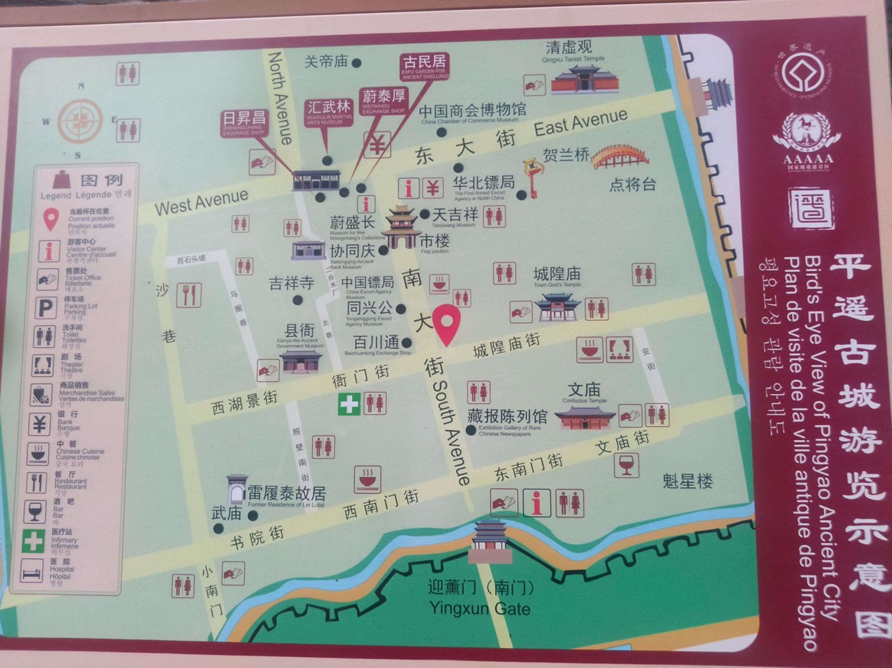 平遙古城素有“中國古建筑的薈萃和寶庫”之稱,文物古跡保存之多、品位之高實(shí)為國內(nèi)所罕見。其中有始建于西周,擴(kuò)建于明洪武3年(1370年),規(guī)模宏大,氣勢雄偉的國內(nèi)保存最完整的古城墻;有始建于北漢天會(huì)七年(963年)被列入我國第三位的現(xiàn)存最珍貴的木結(jié)構(gòu)建筑鎮(zhèn)國寺萬佛殿。殿內(nèi)的五代彩塑堪稱珍品,是研究中國早期彩塑的樣本;有始建于北齊武平二年(571年)、被譽(yù)為“中國古代彩塑藝術(shù)寶庫”,現(xiàn)存宋元明清彩塑2052尊的雙林寺;有中國宋金時(shí)期文廟的罕見實(shí)物——文廟大成殿;有中國金融上的開山鼻祖,被譽(yù)為“天下第一號(hào)”、“匯通天下”的“日升昌”票號(hào);有始建于唐顯慶二年,國內(nèi)古建筑中罕見的“懸梁吊柱”奇特結(jié)構(gòu)清虛觀。觀內(nèi)20余尊木雕神像是研究中國古代木雕造像藝術(shù)和道教發(fā)展的稀有之物;有遍布古城內(nèi)外1000通碑刻及年代不一、形式多樣、色彩續(xù)紛的各種琉璃實(shí)物。同時(shí),平遙古城是中國古代民居建筑的薈萃中心之一。古城內(nèi)現(xiàn)存4000處古、近代民居建筑中,有400余處典型地體現(xiàn)著中國古、近代北方民居建筑的風(fēng)格和特點(diǎn)。