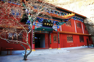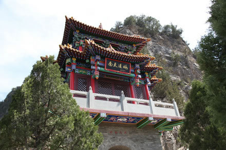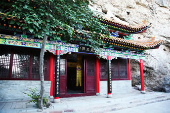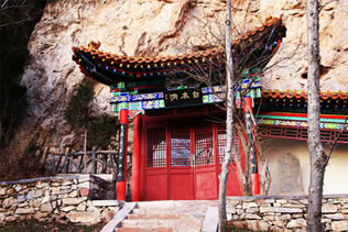 龍王洞在天竺寺景區(qū),位于石膏山上巖溶洞之東側(cè),洞高5米,寬8米,深10米許,洞內(nèi)建龍王祠。龍王祠面闊一間。洞前辟有四級(jí)平臺(tái),紅條石漫地,松柏間植,環(huán)境幽雅。洞東通一小洞,深不可測(cè),洞口壁上有赭紅字跡“龍水宮”;洞內(nèi)泉水汩汩而出,清澈異常。洞外崖壁石縫間平生一株山桃,主桿直徑不過(guò)10厘米,貼地生出百十根分枝,呈扇面狀!吧让妗庇3米多長(zhǎng)、2米多寬。每逢陽(yáng)春三月,滿樹(shù)桃花盛開(kāi),有如鳳凰展翅。這就是石膏山古景之一的“龍鳳呈祥”。 |