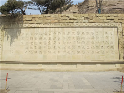 位于云岡石窟一窟山門前的“比丘尼曇媚造像記”石刻,為公元503年(景明四年)的題記。此碑刻有文字110個,再現(xiàn)了當時的社會背景,表達了發(fā)愿人比丘尼曇媚對佛教的高度信仰與虔誠以及希望佛教振興發(fā)展的愿望,文筆優(yōu)美,堪稱佛教發(fā)愿文之最。此碑也向我們展示了北魏時期一種特有的字體。因這種字體在當時多用于碑文,所以后人稱它為魏碑體。魏碑字體外方內(nèi)圓、拙樸有力,是隸書向楷書過渡的字體。由此看來,魏碑書法應是北魏平城時的創(chuàng)造。原物很小,只有30厘米高,28厘米寬,于1956年20窟前考古發(fā)掘,現(xiàn)存于云岡博物館中。