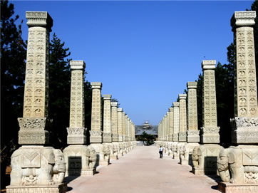 所謂禮佛大道:“恩澤普武周,慈航通法岸”。向西走去,十三對千佛列柱依次列于禮佛大道兩側。神柱高8.73米,系黃沙巖雕刻,由下而上依次為須彌座、力士、白象、柱體的完美組合,造型高聳、精致亙絕,在兩側濃密的松林掩映下,矗立的神柱氣勢雄偉、蔚為壯觀,仿佛通天入地,也仿佛唯有這樣的神柱鋪成的路才可以叫做禮佛大道。千佛列柱的原型在第9、10窟,第12窟,第14窟等處,均以大象、獅子等神物馱承,立體而又恢弘,呈現(xiàn)出平城時期北魏皇宮的恢弘模樣。