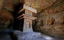 在風化殘破的第14窟中,正壁為一佛二菩薩主像,除下層龕像為晚期補刻外,中上層龕像大致有計劃雕鑿。后室東西壁分作三層:上層以盝形龕交腳菩薩為主體,內(nèi)側有一小坐佛圓拱龕;中層為較大、較深的坐佛圓拱龕,龕外兩側為三層出檐閣樓塔;下層深龕仿佛雕刻了帷幔,東壁為坐佛,西壁龕內(nèi)未完成即被改刻。整個洞窟設計嚴謹、雕刻精美。