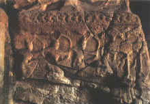 穿過神柱林立的佛光大道向西,呈現(xiàn)于世人眼前的是兩面相對的扇形皇家禮佛浮雕墻。這組正面相對的浮雕墻總體呈圓弧狀,長約20米、高約4米,畫面構圖完美,雕刻細致,以高浮雕的形式,生動表現(xiàn)了北魏皇家盛大的帝后禮佛圖。車轔轔、馬蕭蕭的現(xiàn)場氣氛,充分再現(xiàn)了北魏當時皇帝、皇后前往禮佛的莊嚴肅穆的宏大場面,這種場面讓人自然聯(lián)想到1500多年前云岡石窟作為皇家寺院曾經(jīng)的輝煌,讓人舉目流連。