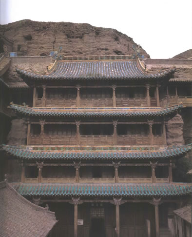 第9、10窟共用一個屋頂,合成統(tǒng)一的外觀造型,洞窟均由前堂后室組成,對稱均衡,大小相當;各個壁面的設計,也力求同一對應。9窟外東側和10窟外西側各豎立一座高大多層的佛塔,洞窟外壁又各自并立兩根石柱,均為三開間,石柱上還雕刻千佛,柱基承以獅、象,蔚為壯觀。