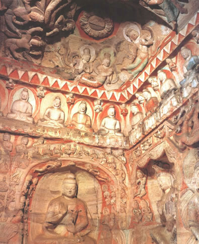 據(jù)初步統(tǒng)計,第15窟現(xiàn)存千佛造像達13200余尊,加上其他各類造像,總數(shù)達13600余軀,占到云岡石窟現(xiàn)存59000余各類人物造像的23%強。整個洞窟集中表達了三世十方皆為佛國、平等眾生皆可成佛的大乘佛教時空觀念,這無疑是云岡石窟走向成熟時代的偉大創(chuàng)作。