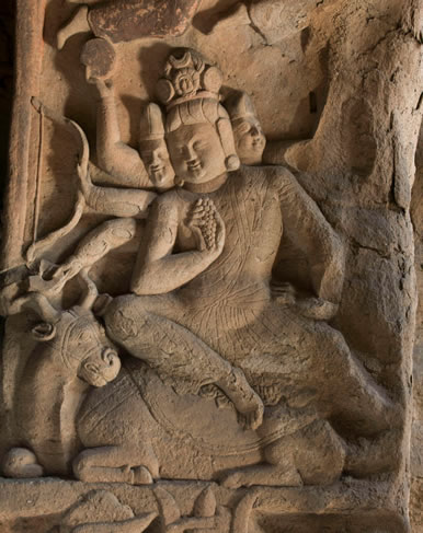窟門拱頂正中雕一朵團蓮,四周飛天起舞。內(nèi)側上拱邊框為連續(xù)排列的忍冬葉,周圍雕伎樂天人。拱內(nèi)側壁分為上下層,下層為天王門神,逆發(fā)胡人形象,手持金剛杵或三叉戟。上層雕出多頭多臂神像,東壁雕三頭四臂,西壁雕三頭六臂。