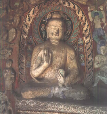 第19窟主佛像結跏趺坐,佛像耳輪齊肩,下頜崩毀,著袒右肩袈裟,輕薄貼體,衣紋簡潔明快。佛像右手舉胸施無畏印,左手掌心向上握法衣于膝上,以表達佛法的無畏與傳承?咄鈻|西耳洞中,各雕刻一尊倚坐佛像,西耳洞佛像,耳廓寬大垂肩,體魄挺拔勁健。這種分窟安置三世佛的布局設計,既有變化,又顯莊嚴,是北朝石窟形制的新創(chuàng)舉。