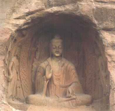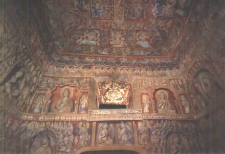 后室北壁頂部三角紋帶雕刻之下有上、下兩層大龕,下龕為圓拱龕,高4米,龕內(nèi)雕坐佛。上龕為盝形帷幕龕,龕內(nèi)中央為倚坐佛,兩側各有一交腳菩薩,最外兩側為思惟菩薩。龕楣十二格內(nèi)各雕一身飛天,龕楣上方雕有十四身伎樂天。