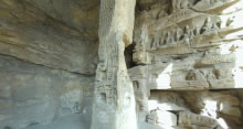 第7窟前室北壁上開明窗,下鑿窟門,壁面風化嚴重,但其窗門外側殘留的多層造像與印度阿旃陀的大拱門洞窟外壁雕刻十分相似。第7窟前室東壁上部均分層分欄雕刻佛本生故事畫面。后室北壁造像分為上下兩層大龕,下層龕內(nèi)為二佛并坐。上層龕內(nèi)中央主像為交腳彌勒菩薩,兩側為倚坐佛像。