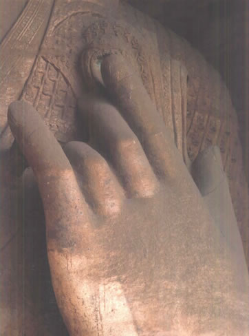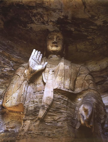 露天大佛高約13.7米,端坐于石臺座之上。佛首磨光肉髻,方圓面相,廣額豐頤,眉眼細長,鼻梁挺直,大耳垂肩;眉間施白毫,嘴唇略薄,唇上、下巴有八字胡須。眼中瞳孔為琉璃鑲嵌,大約是在遼代安裝。佛身挺拔壯碩,兩肩寬厚,著袒右肩式袈裟。袈裟質地厚重,衣褶自然流暢,具有犍陀羅造像遺風。大佛內(nèi)衣輕薄貼體,整體疏密得當,雕刻工藝精湛。大佛神情莊嚴,慈祥泰然,結跏趺坐,雙手于腹間相會疊加,呈禪定手印。可惜手部與雙腿風雨侵蝕,雕飾全無。但是大佛姿態(tài)雄偉,氣宇軒昂,生氣勃勃,融合東西方雕塑藝術于一體,是兼?zhèn)淞朔鹜印叭、八十種隨形好”的造像珍品。